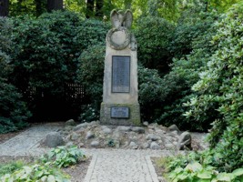 Kleiner Ehrenhain mit Denkmal aus Sandstein und einer Gedenktafel.