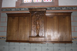 in der Kirche; Gedenktafeln unterhalb zweier gegenüberliegenden Fenstern; zusätzlich Hinweise zu Soldaten von privaten Gedenksteinen