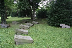 Im alten Friedhof; in einem Halbkreis angeordnete, am Boden liegende Steinplatten (zum Teil nicht lesbar).