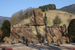 im Friedhof; Wand, mittlerer Teil erhöht mit Bildrelief „Gott segnet Gefallenen“, vor dem Denkmal Steinkreuze mit Namen; zusätzlich Hinweise zu Soldaten von privaten Gedenksteinen