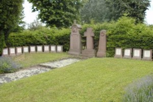 Das Kriegerdenkmal befindet sich auf dem Friedhof. In der Mitte ein Kreuz. Rechts davon eine pyramidenförmige Säule mit einem Lorbeerkranz im oberen Teil. (1866) Links davon eine Gedenkplatte mit herausgearbeitetem Stahlhelm auf Lorbeerblättern. Oben ein deutsches Kreuz. (1. Weltkrieg) Einzeln nebeneinander stehende Sandsteinplatten mit hellen Namenstafeln. (2. Weltkrieg)
