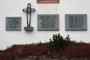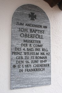 außen an der Kirche, beim Eingang (1870/71) und seitlich Gedenktafeln (2.WK)