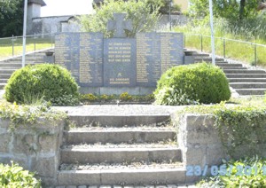 Denkmal am Aufgang zur Pfarrkirche für die Opfer der beiden Weltkriege und des Frankreichfeldzuges. Granitsteinplatten mit Namen und Inschrift. Mittig ein großes EK aus Stein