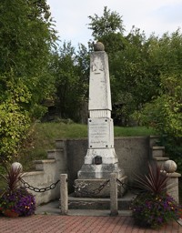 gegenüber der Kirche; schlanke Säule, an drei Seiten Gedenktafeln und Inschriften