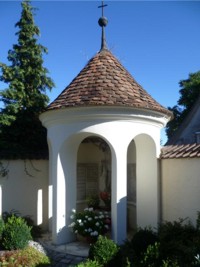 Pavillonartige Nische in der Kirchhofmauer in Steinhausen. An den Innenwänden Steintafeln mit Inschrift und den Namen der Toten.