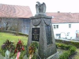 Das Kriegerdenkmal - eine viereckige nach oben konisch werdende Steinsäule - befindet sich vor der evangelischen Kirche.