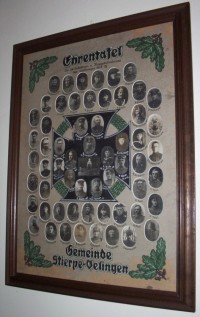 Die Gedenktafel der Gefallenen und Kriegsteilnehmer hängt in der Schützenhalle des Schützenvereins Stirpe-Oelingen, Am Schützenplatz 3, Bohmte.