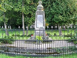 Stele an der Kirchhofsmauer. Das Denkmal vom 1. Weltkrieg wurde auf der Rückseite durch eine Gedenktafel für im 2. Weltkrieg gefallene Ortseinwohner sowie Flüchtlinge ergänzt