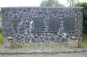 Auf dem Friedhof befindet sich eine Steinwand. An dieser sind zwei Kreuze aus Metall befestigt. Daneben An der Mauer sind drei Namenstafeln aus Metall befestigt.