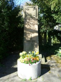 Kriegerdenkmal vor der Friedhofsmauer des Friedhofs Stuttgard-Heumaden. Quadratische Steinsäule mit den Namen der Toten, auf dem Kapitell stilisierte Eiserne Kreuze.