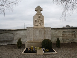 Im Friedhof ein Denkmal. Mittlerer Teil erhöht mit Bildrelief „Jesus mit gefallenem Soldaten und Engel“