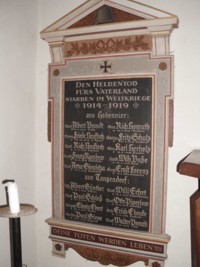 Denkmal 1. Weltkrieg in Form eines großen Findlings auf dem Friedhof, Tafel 1. Weltkrieg in der Kirche