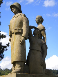 Sandsteinskulptur eines stehenden Soldaten mit einer stehenden und einer knieenden Frau, früher auf hohem,