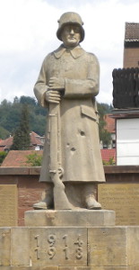 der Sandsteinskulptur eines stehenden Soldaten auf Sandsteinsockel, dahinter an der Mauer drei Sandsteintafeln