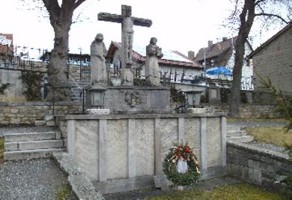 Das Kriegerdenkmal befindet sich in einer Park-ähnlichen Anlage. Sechs Namenstafeln sind in einer Steinwand eingesetzt. Darüber befindet sich eine Kreuzigungsszene.