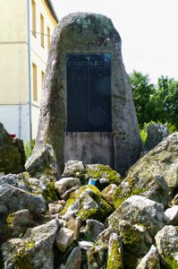 Naturstein mit Metallplatte auf Natursteinhügel.