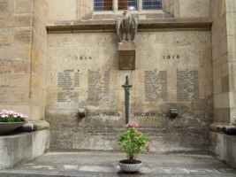 links in Bronzebuchstaben 1914, rechts 1918. Darunter in Bronzebuchstaben Namen und Daten, dazwischen stehendes