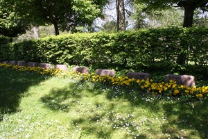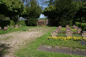 im Friedhof; Soldatengräber: Steinkreuz in „EK“-Form; auf der Fläche nebenan Kriegsgräber, ein Reihe von Steinquadern; zusätzlich Hinweise zu Soldaten von privaten Gedenksteinen