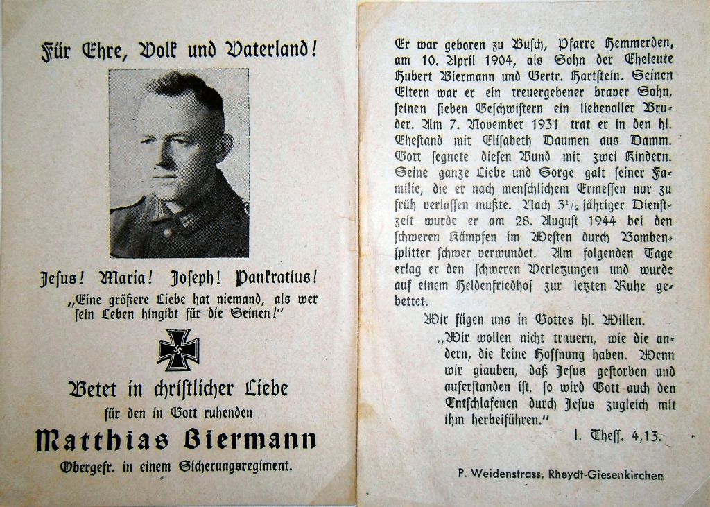 Quelle: Totenzettelsammlund der „Heimatfreunde Glehn e.V.“, Korschenbroich (www.heimatfreunde-glehn.de). Ergänzungen in blauer Schrift: www.volksbund.de/graebersuche und eigene Ermittlung.