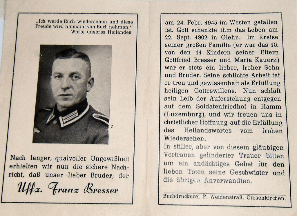 Quelle: Totenzettelsammlung der „Heimatfreunde Glehn e.V.“, Korschenbroich (www.heimatfreunde-glehn.de). Ergänzungen in blauer Schrift: www.volksbund.de/graebersuche und eigene Ermittlung.