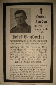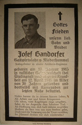 Gastwirtssohn von Niederhummel. In russischer Gefangenschaft (bei Stalingrad) nach schwerer Krankheit am 12. April 1945 im Alter von 30 Jahren gestorben und dortselbst mit Kameraden zur letzten Ruhe bestattet.