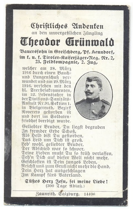 Bauerssohn in Greischberg, Pf. Henndorf, welcher am 28. März 1916 durch Bauch.-und Lungenschuß verwundet und am 29. März 1916, versehen mit den hl. Sterbesakramenten, im 32. Lebensjahres in der Divisons-Sanitätsanstalt Nr.91, Sektion 1, in Bielgereuth, Bezirk Rovereto gestorben ist und dort im Soldatenfriedhof beerdigt wurde.