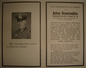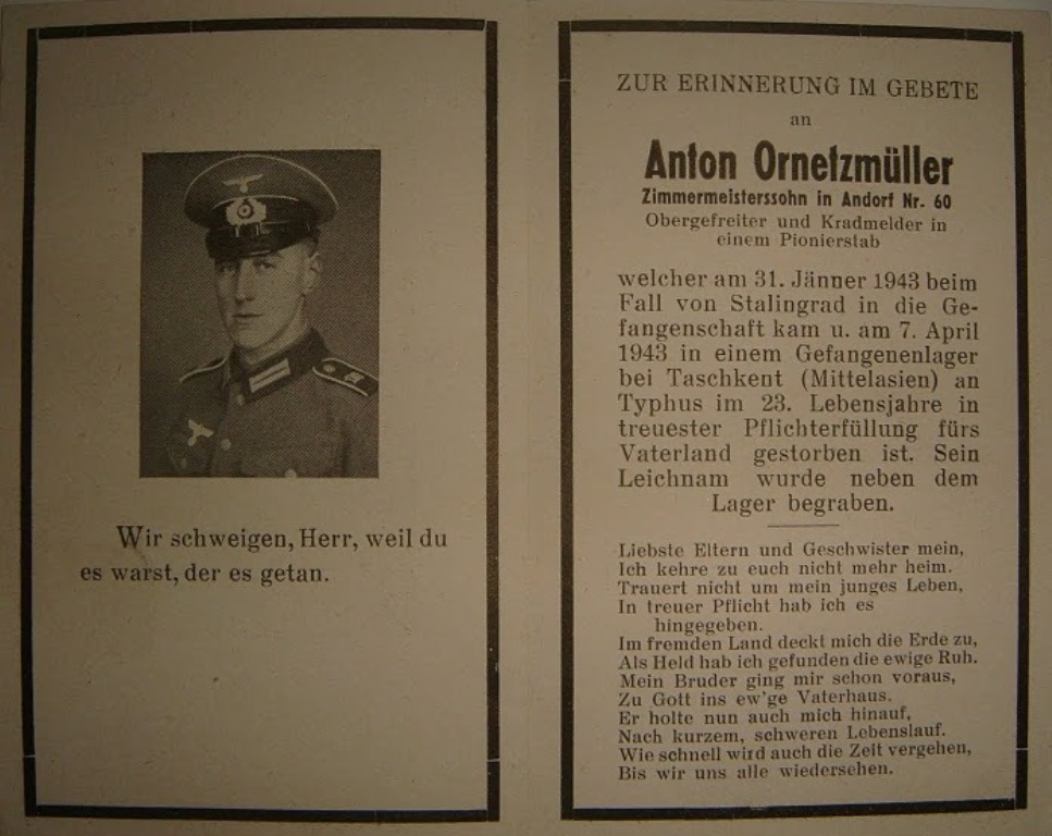 Zimmermeisterssohn in Andorf Nr. 60 und Kradmelder welcher am 31. Jänner 1943 beim Fall von Stalingrad in die Gefangenschaft kam und am 7.4.1943 in einem Gefangenlager bei Taschkent (Mittelasien) an Typhus im 23. Lebensjahre in treuester Pflichterfüllung fürs Vaterland gestorben ist. Sein Leichnam wurde neben dem Lager begraben.