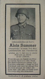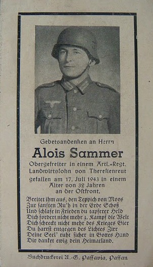 Obergefreiter in einem Art.-Regt. Landwirtssohn von Theresienreut gefallen am 17.Juli 1943 in einem Alter von 32 Jahren an der Ostfront