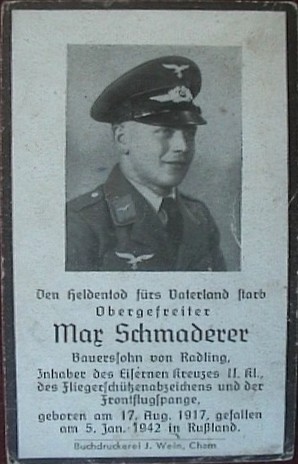Bauernsohn von Radling. Inhaber des Eisernen Kreuzes II.kl. des Fliegerschützenabzeichens und der Frontflugspange. Ruht auf der Kriegsgräberstätte in Sewastopol – Gontscharnoje (UA)