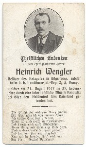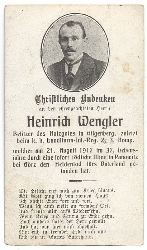 Besitzer des Hatzgutes in Gilgenberg, welcher am 21. August 1917 in 37. Lebensjahre durch eine sofort tödliche Mine in Rankowtz bei Görz den Heldentod fürs Vaterland gefunden hat.