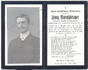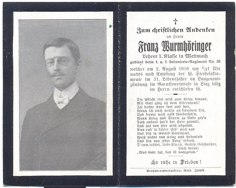 Lehrer 1.Klasse in Mettmach, welcher am 2. August 1916 um ½ 1 Uhr nachts nach Empfang der hl. Sterbesakramente im 31. Lebensjahre an Lungenentzündung im Garnisonspitale in Linz selig im Herrn entschalfen ist.