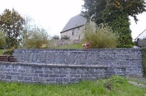 Vor der Kirche befindet sich das Kriegerdenkmal. Eine Steinmauer an der insgesamt acht Namenstafeln aus Metall angebracht sind.