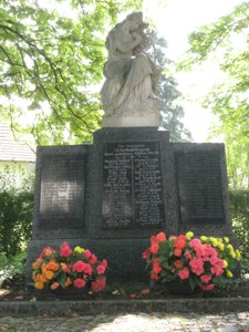 Rechteckiger Granitblock an dem drei Marmortafeln mit Namen befestigt sind. Auf dem Granitblock sitzt eine trauernde Frau. Die Tafel in der Mitte ist zweispaltig und nennt die Namen des Ersten Weltkrieges. Die links und rechts angebrachten Tafeln benennen die Opfer des Zweiten Weltkrieges