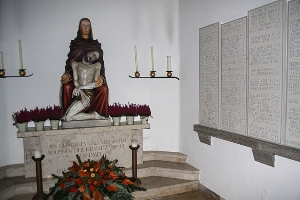Im Friedhof; Gedenktafeln in der Friedhofskapelle; zusätzlich Hinweise zu Soldaten von privaten Gedenksteinen