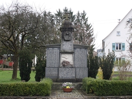 Bei der Kirche eine freistehende Wand; mittlerer Teil vorspringend und erhöht, Bildrelief „gefallener Soldat und Engel“; zusätzlich Hinweise zu Soldaten von privaten Gedenksteinen