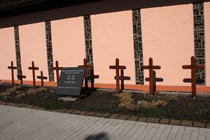 bei der Abdankungshalle; eine Reihe von Holzkreuzen, dazwischen Gedenktafel