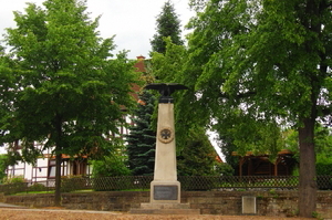 Volkmarsen, Landkreis Waldeck-Frankenberg, HessenPLZ 34471 An der Lütersheimerstraße steht in einer kleinen Grünanlage ein Denkmal zum Deutsch-Französischen Krieg. Auf einem Sockel erhebt sich ein Obelisk, der mit einem Eisernen Kreuz im Lorbeerkranz dekoriert ist und einen Adler mit ausgebreiteten Flügeln trägt. Im Sockel sind die Orte von Schlachten des Krieges 1870/71 sowie die Namen von drei Gefallenen eingemeißelt. Auf der Vorderseite trägt der Sockel eine Metallplatte mit der Widmung.