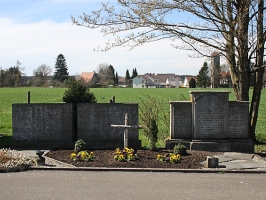Im Friedhof zwei Gruppen von freistehenden Gedenkwänden, davor ein Birkenkreuz; zusätzlich Hinweise zu Soldaten von privaten Gedenksteinen