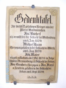 Gedenktafel für die 1870-71 gefallenen Krieger aus der Pfarrei Waldmünchen. R. I. P.