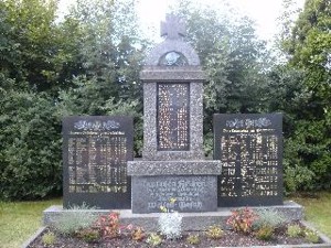 Vor dem Friedhof befindet sich das Kriegerdenkmal. In der Mitte, ein Gedenkstein, in dessen Mitte sich eine Namenstafel aus Marmor befindet. Als Abschluß ein deutsches Kreuz, darunter ein Stahlhelm mit Lorbeerästen. Links und rechts sind zwei Namenplatten aus Marmor angefügt.