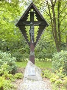 Auf dem Waldfriedhof steht ein Holzkreuz mit Jesusfigur. Am Holzpfosten ist eine Plakette angebracht (1. WK) Darunter ein Steinfindling mit angebrachter Metallplatte (2. WK).