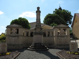 Gefallenen des 1. Weltkriegs. Vor der Mauer steht ein reich verzierter Obelisk mit den Namen von