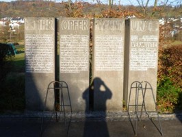 Vier freistehende Steintafeln auf dem Friedhog in Birkmannsweiler mit den Namen der Toten beider Weltkriege (2. Weltkrieg nicht aufgenommen).