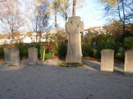 Christusrelief auf stark reduziertem Steinkreuz, daneben Steintafeln mit den Namen der Toten beider Weltkriege (2. Weltkrieg nicht aufgenommen).
