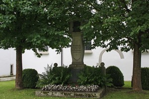 bei der Kirche; unten Gedenktafeln und in der Mitte Säule; zusätzlich Hinweise zu Soldaten von privaten Gedenksteinen