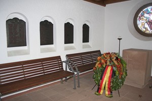 im Friedhof; separater Raum in der Abdankungshalle, in der Mitte Quader mit Inschrift, Gedenktafeln in den Fensternischen