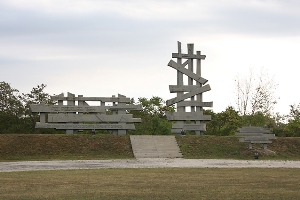 an der Römerstrasse; auf einem Erdwall drei Gebilde aus Betonelementen, Inschriften, am Zugangsweg Gedenktafel