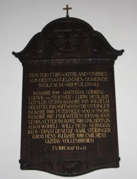 Den Tod fürs Vaterland starben aus der evangelischen Gemeinde Wolfach-Ruppoldsau (Namen) Ev.Joh.Kap. 15 v. 13