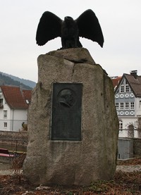 an der Hauptstrasse, bei der Brücke über die Kinzig; Naturstein, vorne Gedenktafel, oben Adler; daneben Friedenslinde mit Tafel