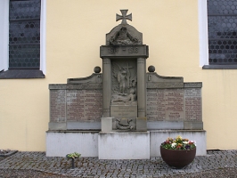 Aussen an der Kirche ein Denkmal; der mittlere Teil vorspringend und erhöht; Bildrelief „sterbender Soldat mit Engel“